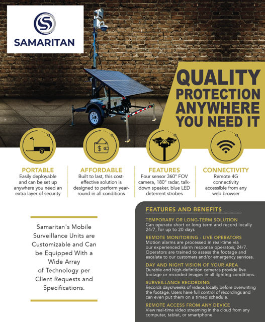 At Samaritan, we’re more than just a security provider—we’re your trusted partner in safeguarding what matters most. With our Mobile Surveillance Units, you can rest assured that your assets, property, and personnel are protected around the clock, no matter the circumstances. Contact us today to learn more about how our innovative security solutions can elevate your peace of mind.